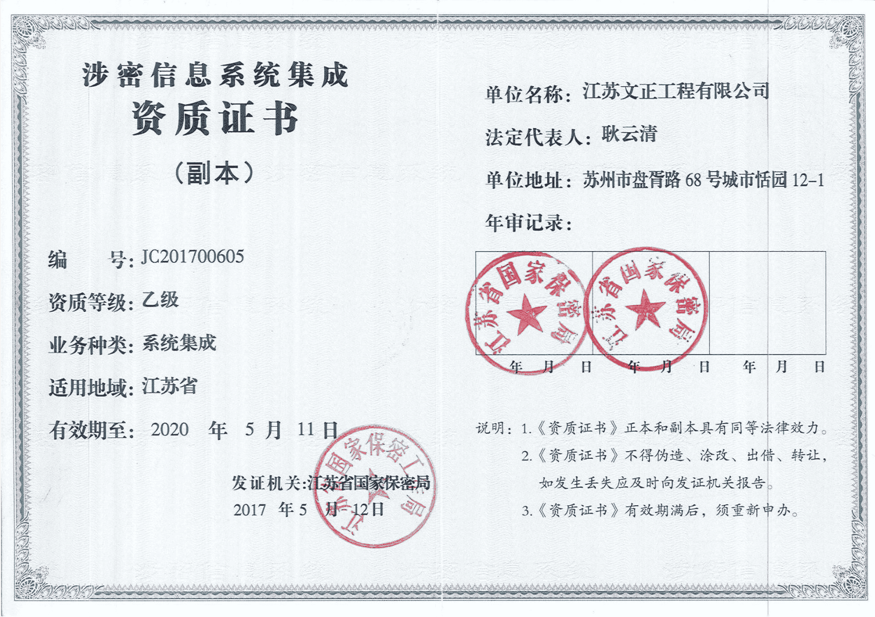 涉密信息系统集成资质证书乙级