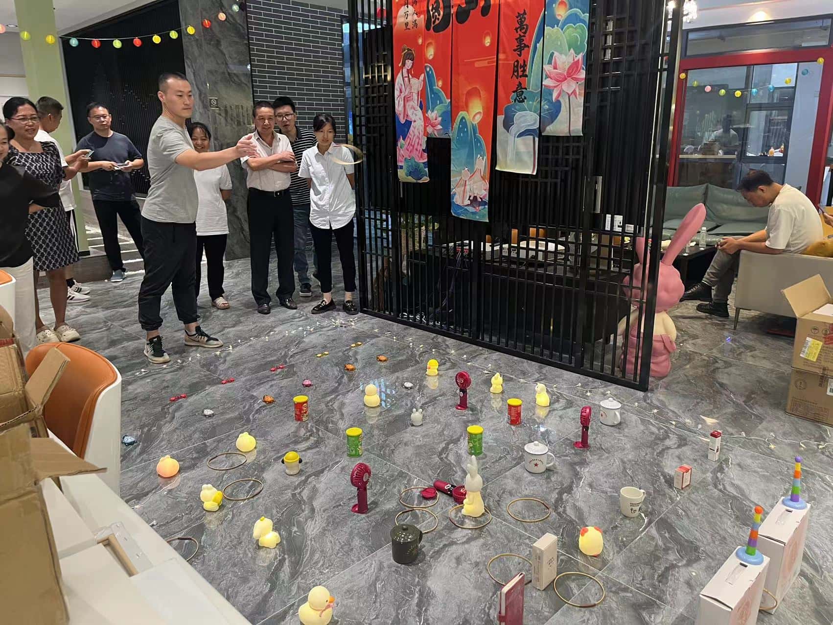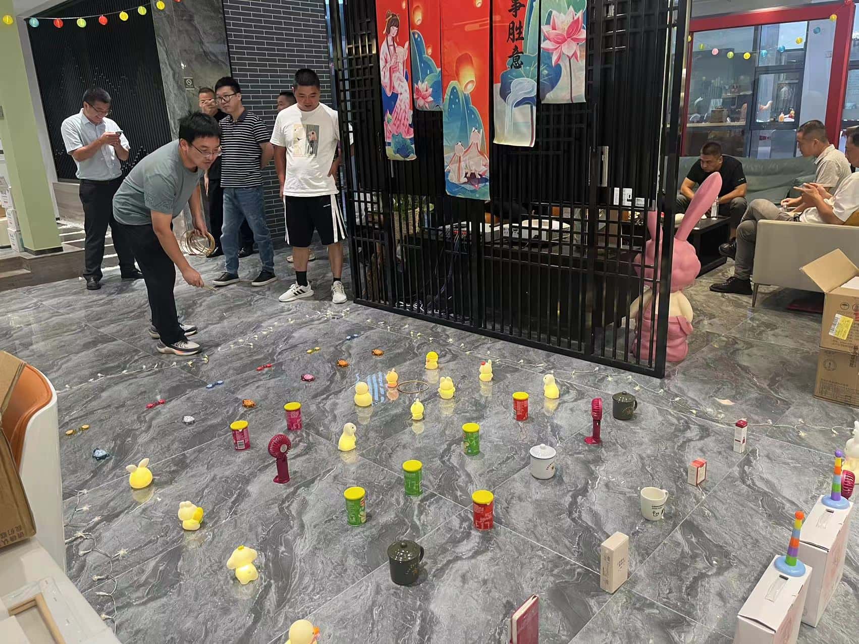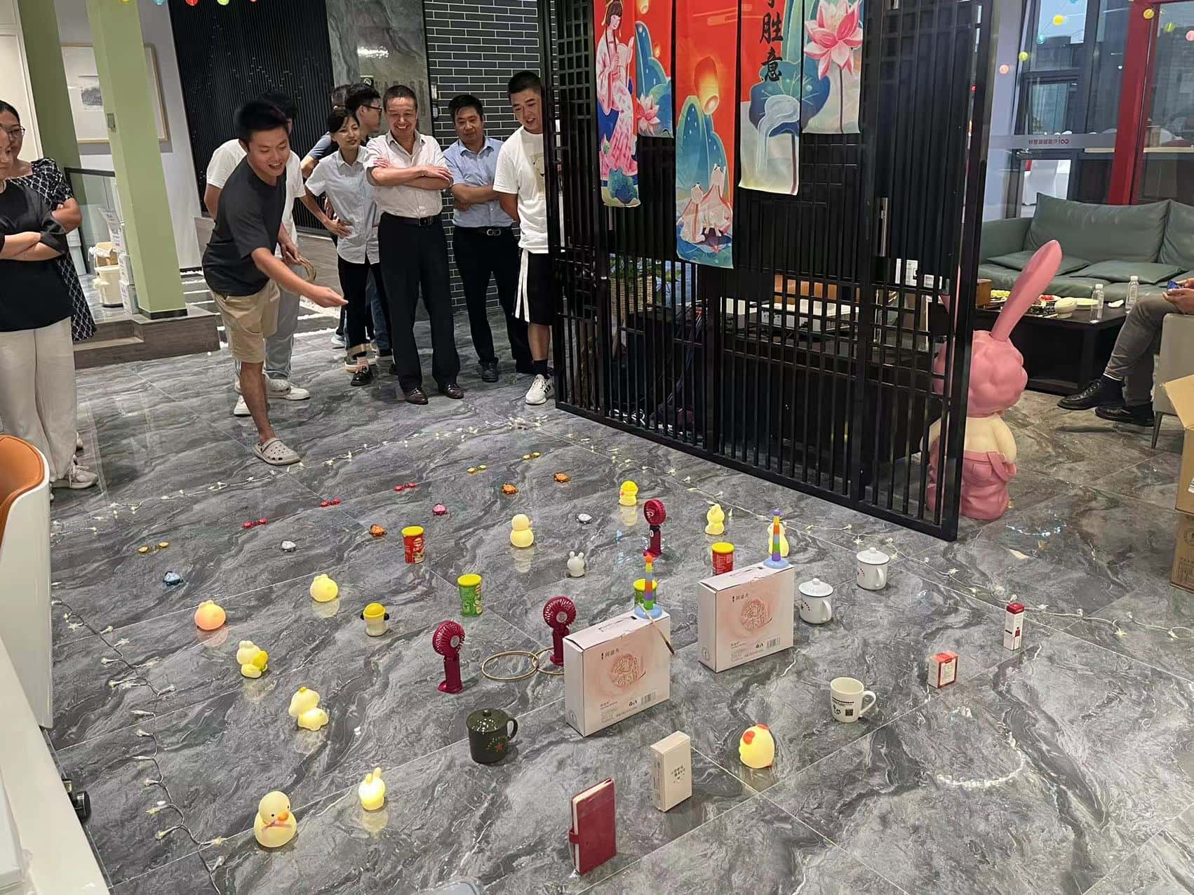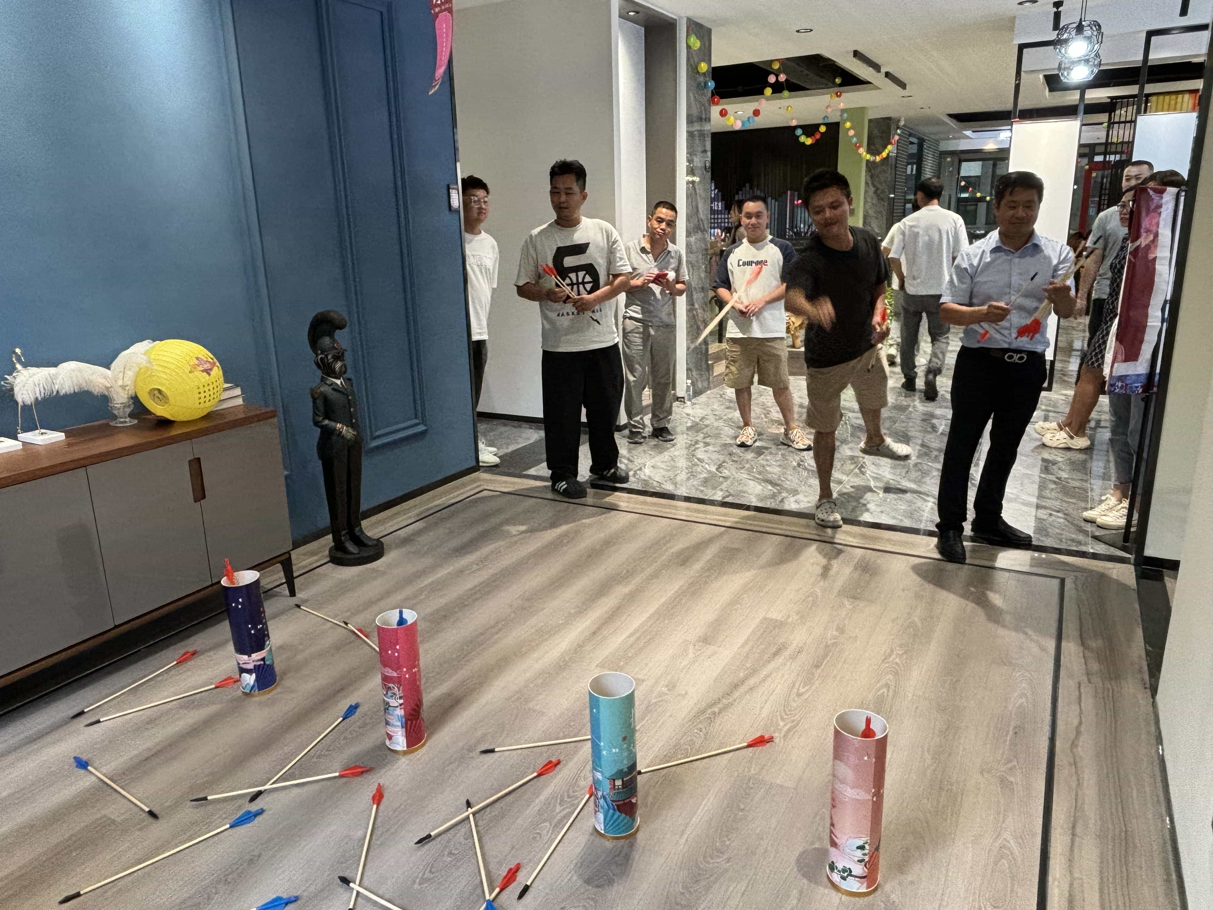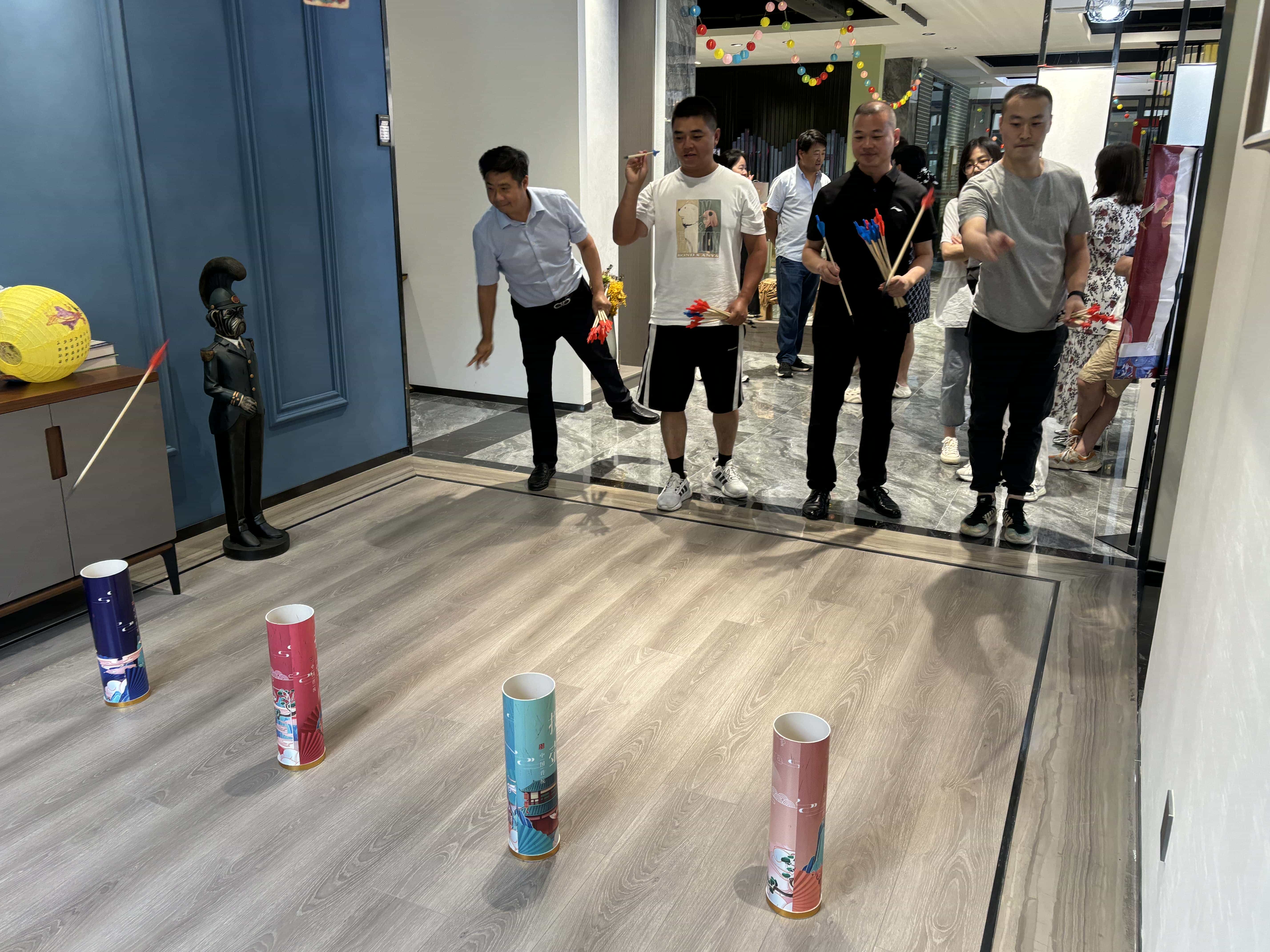 投壶游戏区更是重现了古时的雅趣。修长的箭矢在员工们的手中轻轻飞出,带着一种优雅的力量,朝着壶口奔去。每一次箭矢与壶身的触碰,都像是在诉说着古老与现代的对话,让人不禁遥想起古人在庭院中进行投壶游戏时的风雅之景。