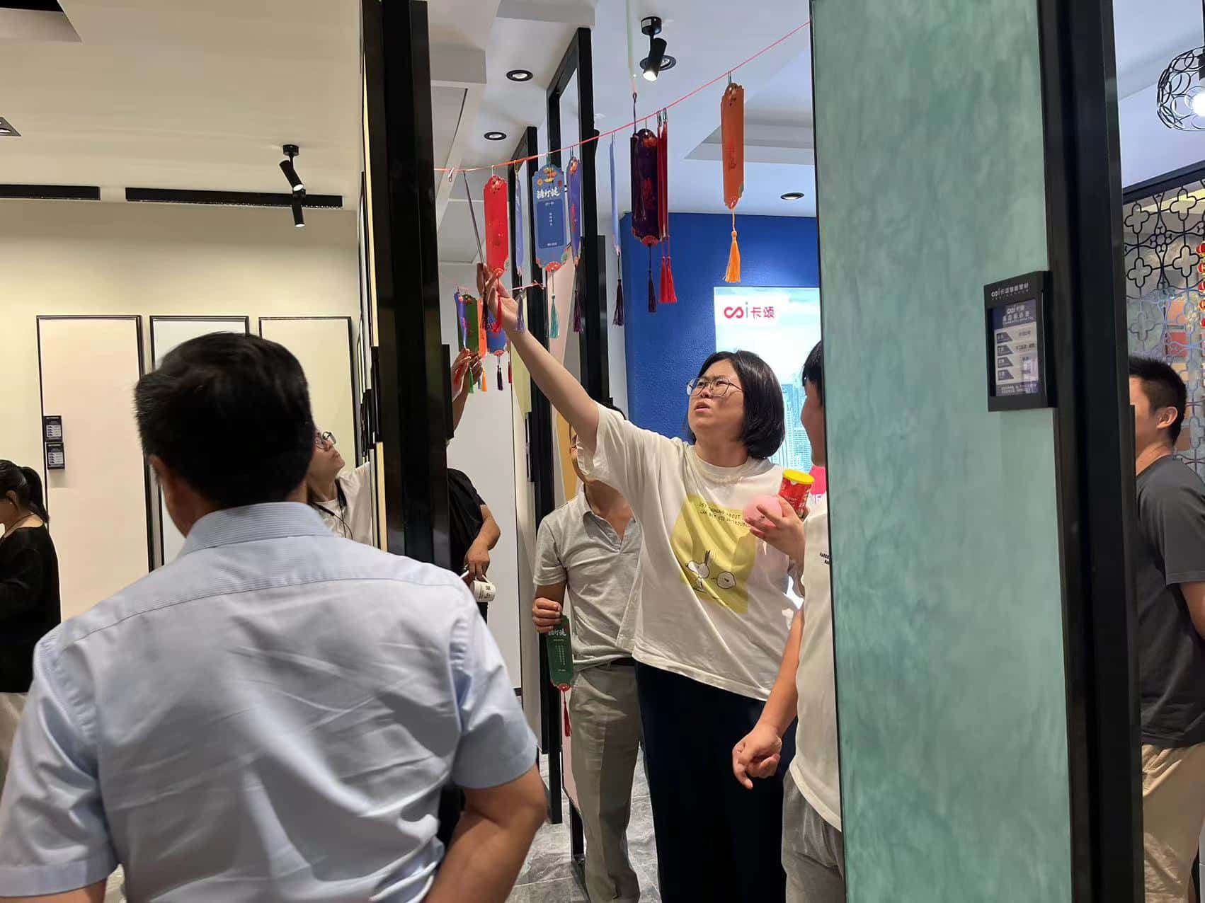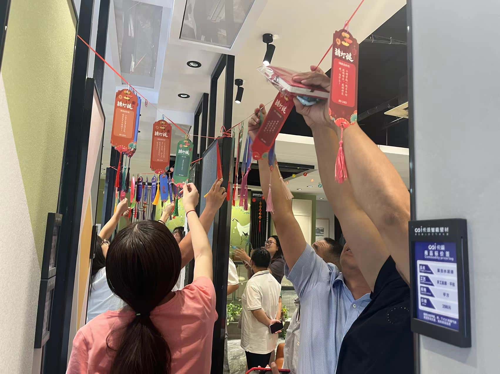猜灯谜区则像是一座充满智慧挑战的神秘花园。一张张灯谜在微风中轻轻摇曳,灯纸上写满了各种各样巧妙的谜题。员工们或是独自沉思,眉头轻蹙,眼神中闪烁着思索的光芒;或是三五成群,热烈讨论,智慧的火花在彼此的交流中碰撞。