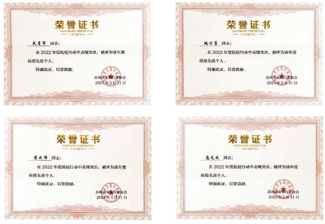在2022年抗击疫情的特殊时期,我司员工武青军、端方勇、蒋成伟及庞元成尽职尽责,积极响应国家号召,他们用实际行动向社会传递正能量,他们的付出和努力被评为2022年度抗疫先进个人,充分证明了我司员工深深的社会责任感和崇高的职业精神。