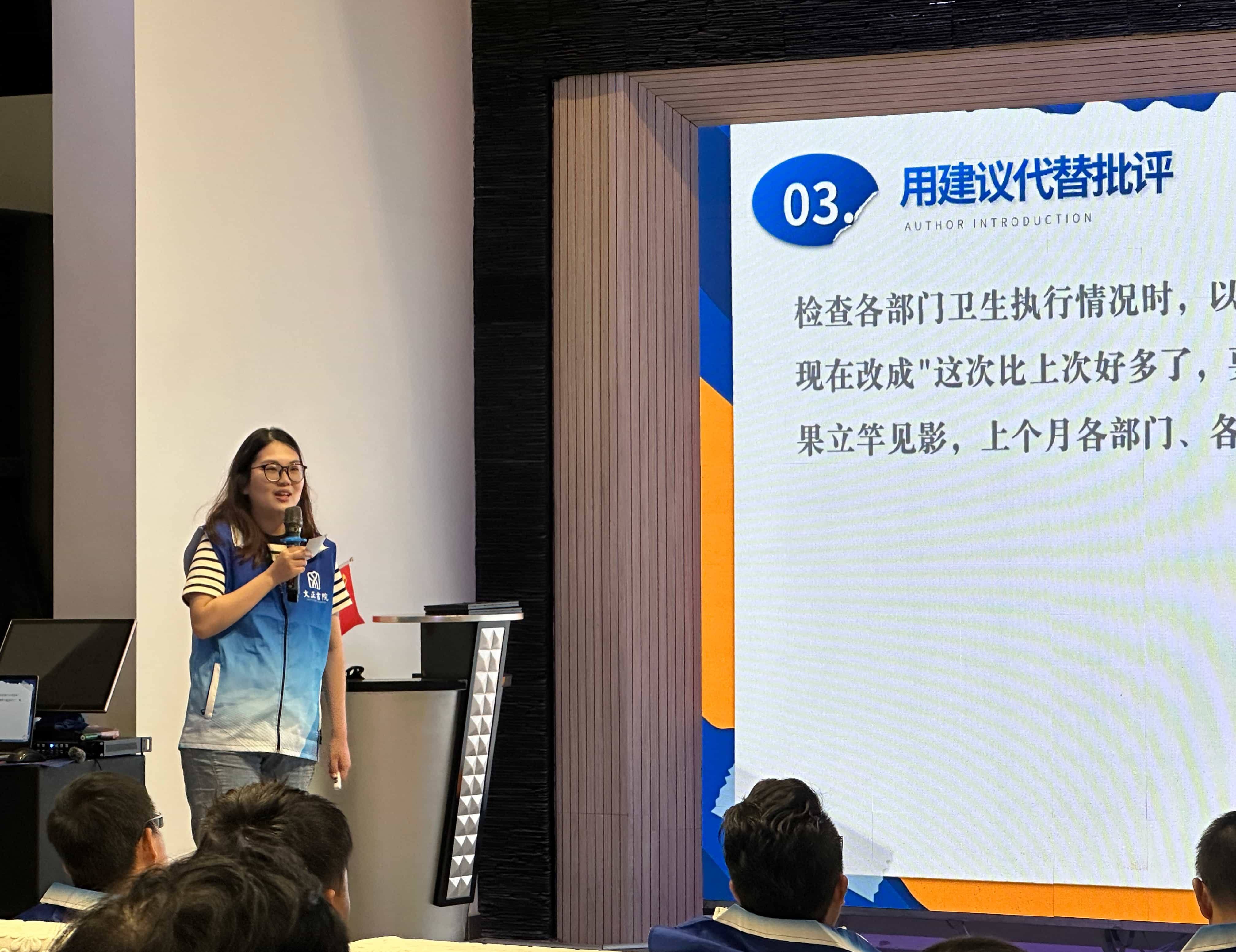 在主题分享环节,公司高管结合自身经验,为员工带来实用职场锦囊。耿总以“内部沟通技巧”为主题,通过真实案例解析职场沟通痛点,并现场教学“三明治沟通法”——以肯定开头、建议居中、鼓励结尾,帮助员工在批评与建议中实现温和高效的表达。